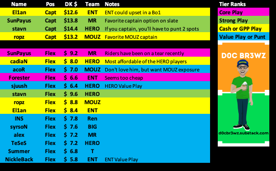 Because these matches are all best of 1 map, I am not recommending Cash contests (50/50s, Double Ups). My rationale for this stems from the Bo1 format, which tends to lead to more upsets than a normal Bo3 match and also does not usually see 3 players from the same team score really well. It’s just tough to build a solid cash core on slates like these, so my advice is to avoid cash contests.