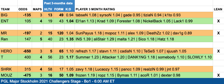 This slate is comprised of matches from Round 1 of the PGL Major Stockholm 2021 Challengers Stage. My leans are Entropiq (+105), Movistar Riders (-197), Heroic (-650) and MOUZ (-475).