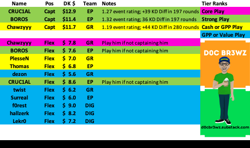 Endpoint (-165) has already beat AGO (+125) in group play. EP is the top seed in the playoffs and they are my lean. BOROS ($11.4/$7.6) and CRUC1AL ($12.9/$8.6) are #2 and #3 respectively when looking at event player rating. Salaries on this slate are loose, so we will have no problem getting both these players in, with one of them at captain.