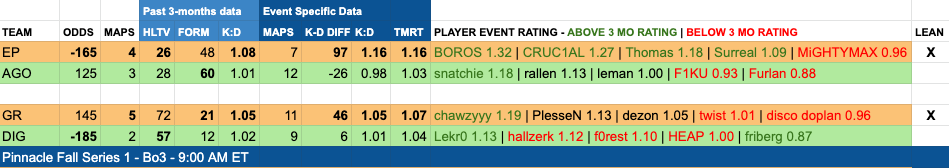 ESL Pro League Season 14 has an off day with the Playoffs Round 1 set to begin on Tuesday. To tide us over until the top teams are back in action, DraftKings is offering a slate of Pinnacle Fall Series 1 matches. Because this is just a 1-day filler slate, I’m going to provide my Notes Sheet and Player Sheet with just a brief slate analysis. On Sunday, September 6, 2021, DraftKings is offering a 2 match CS:GO slate with a lock at 9:00am ET. Here is my ‘Notes Sheet’ for this slate.