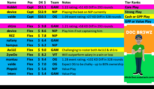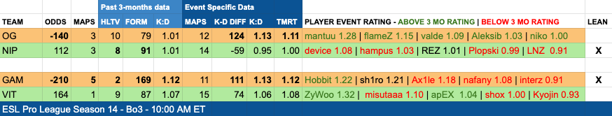 In both Cash contests (50/50s, Double Ups) and multi-entry GPP contests, I’m going to be building 3-3 lineups from GAM and NiP players. I will build a OG lineup too, just to have a piece of them. Finally, there is merit in a 3/2/1 build of 3 NiP/2 GAM/ZywOo.